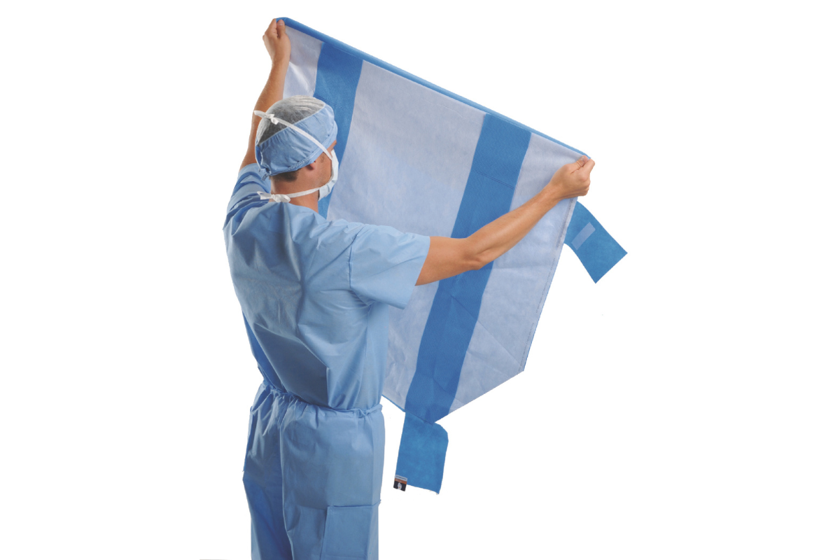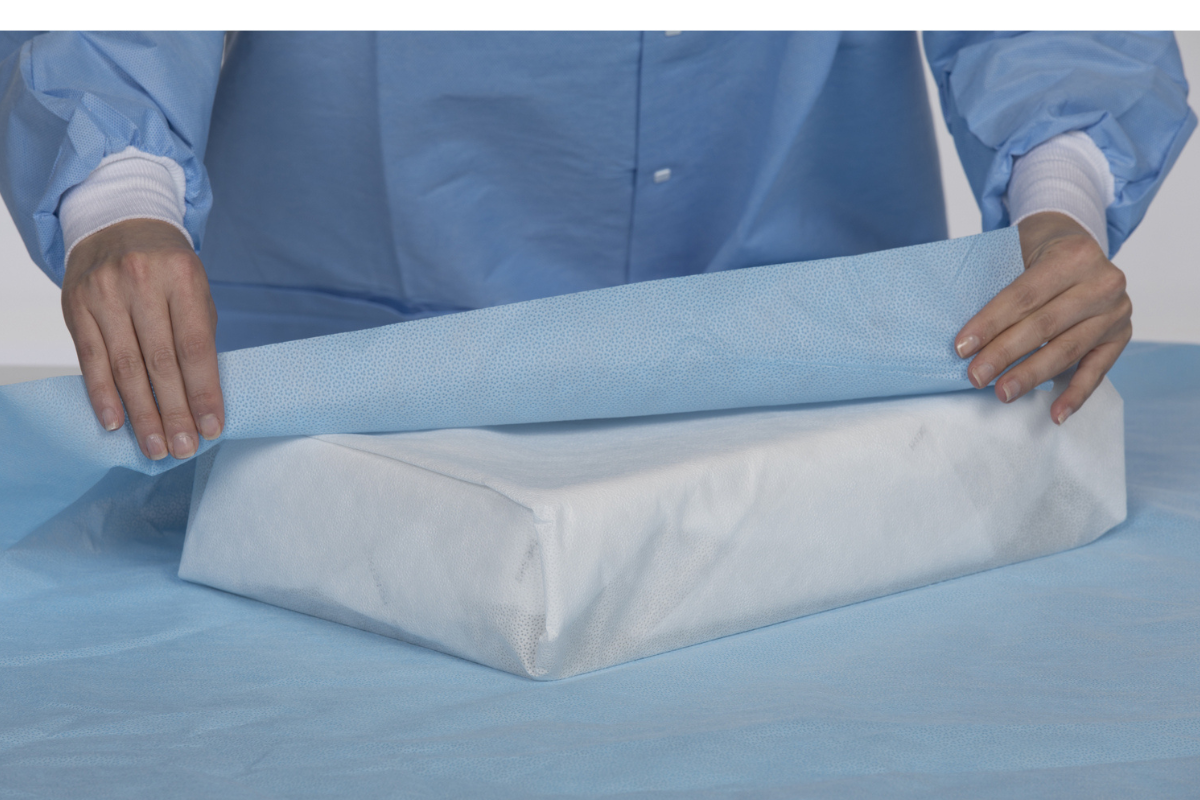 Envolvederas para esterilización H400 SEQUENTIAL de HALYARD. Fabricadas con tecnología SMS para proporcionar una barrera microbiana robusta y resistente a la abrasión.