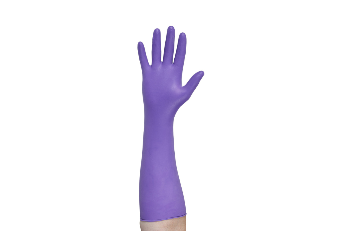Guantes de examen PURPLE NITRILE MAX de HALYARD. Con un puño extendido de 16.5 pulgadas para una máxima protección en el manejo de químicos.