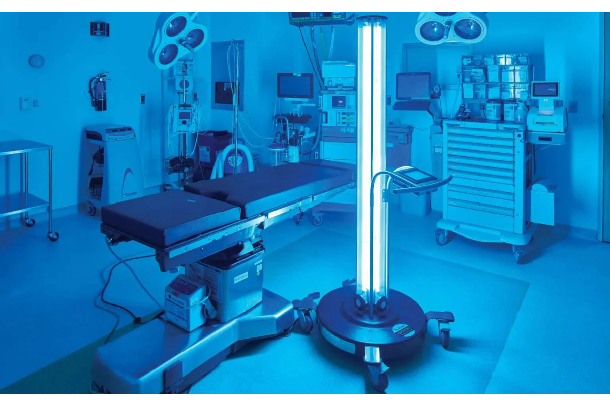 Equipo de sanitización en base a luz UV-C de UVDI. Tecnología de luz ultravioleta avanzada para la sanitización rápida y validada de áreas hospitalarias, eliminando hasta el 99.99% de patógenos.